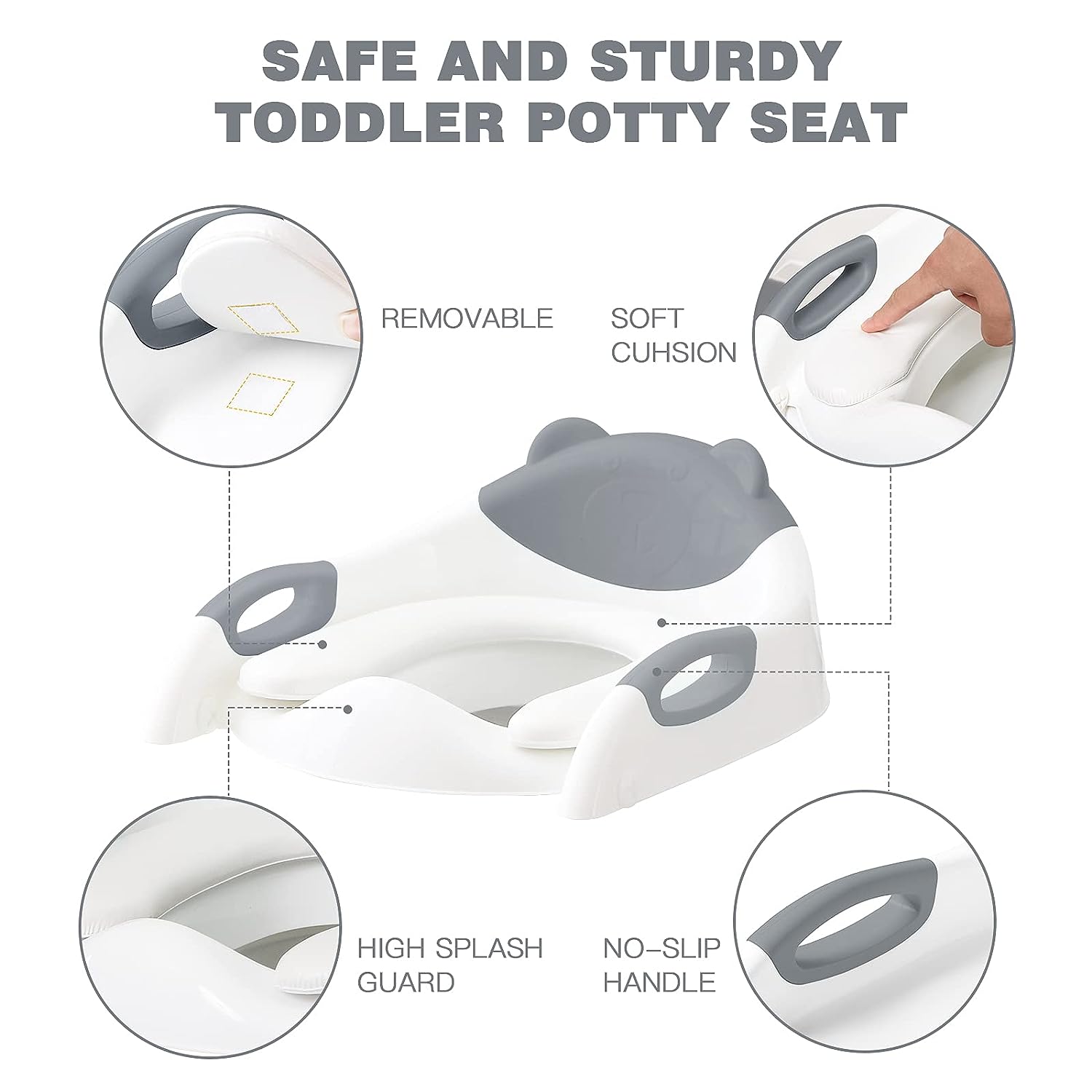 - SPECIAL DESIGN: This upgraded toilet seat contains many advantages:(1) design for adjustable ladder for different height; (2) design for protecting the spine; (3) design to avoid splashing urine; (4) design of soft and removable cushion for comfortable and clean use; (5) foldable design; (6) rotating design for adjusting different toilet.